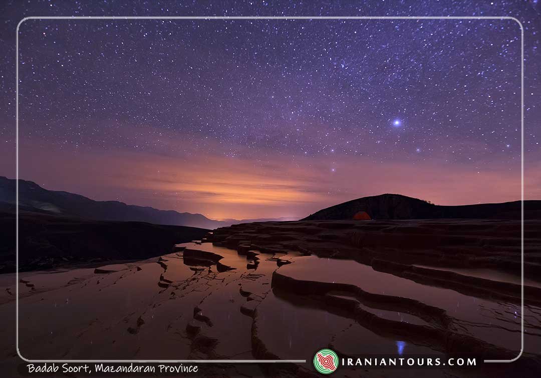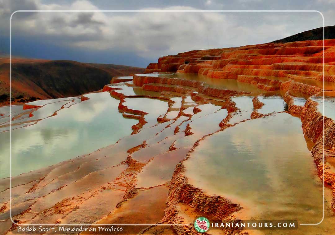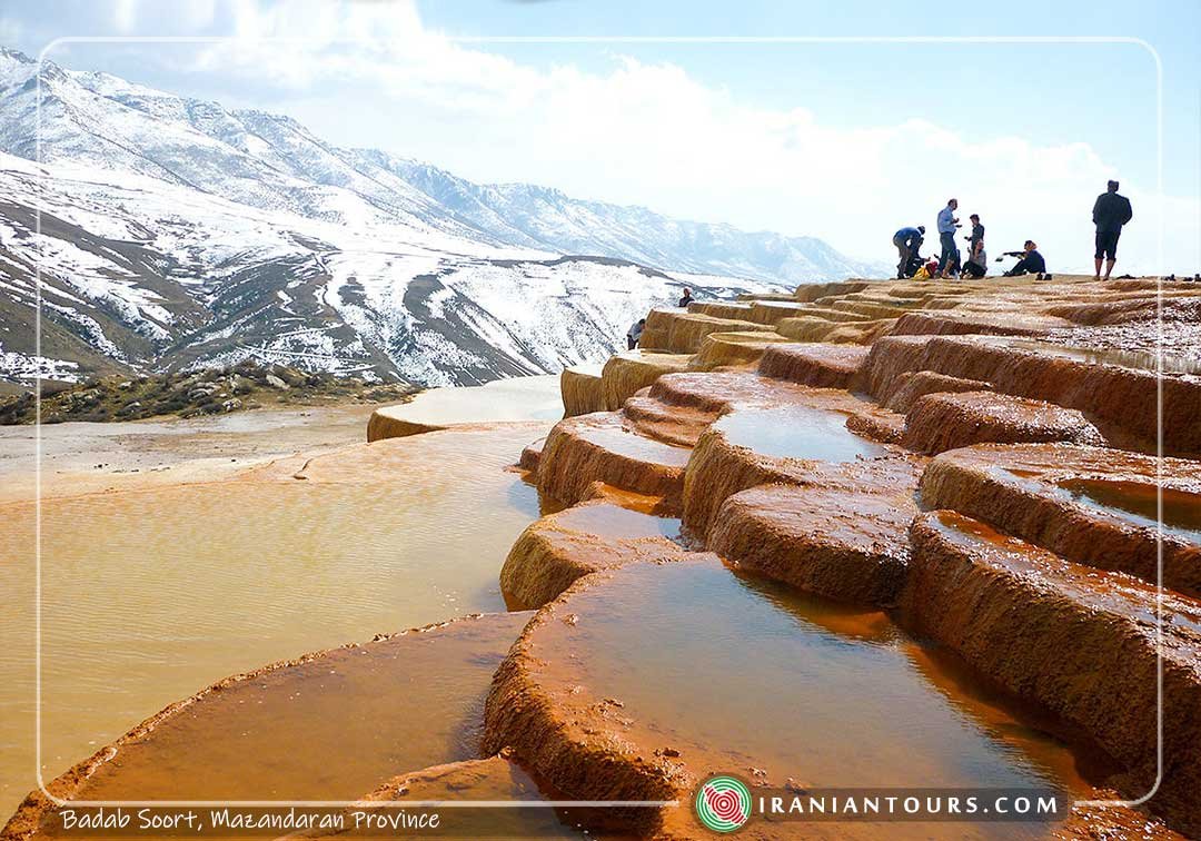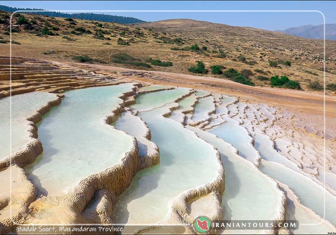 Badab Soort ( Badab-e Surt), are rare terraced springs in Iran and the world that includes several springs with completely different water in terms of color, smell, taste, and volume. It has been inscribed as the second saltwater spring in the world after Pamukkale spring in Turkey. Badab Soort springs consist of two springs; one with an upper volume of water, very salty and not being frozen in winter due to its salinity which has a pool with a diameter of 15 meters with high depth and it is mainly used for swimming in summer.