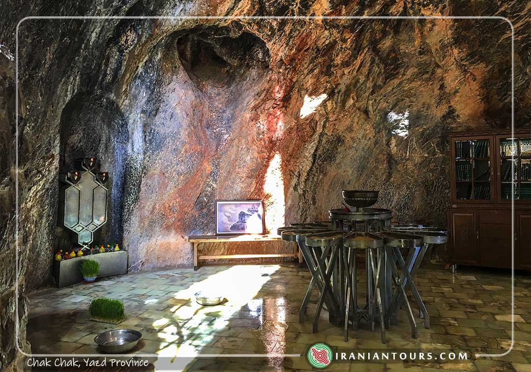 Chak Chak temple is revered for its spiritual values in the hearts of the followers of the ancient Iranian religion. The fact that caves and cracks within the rocky slopes of the mountains had long been a refuge for spiritual people to sit in, in absolute isolation and meditate should come as no surprise.