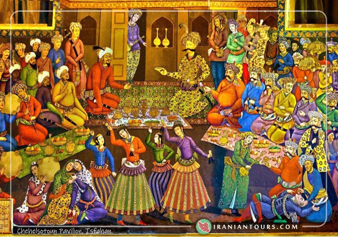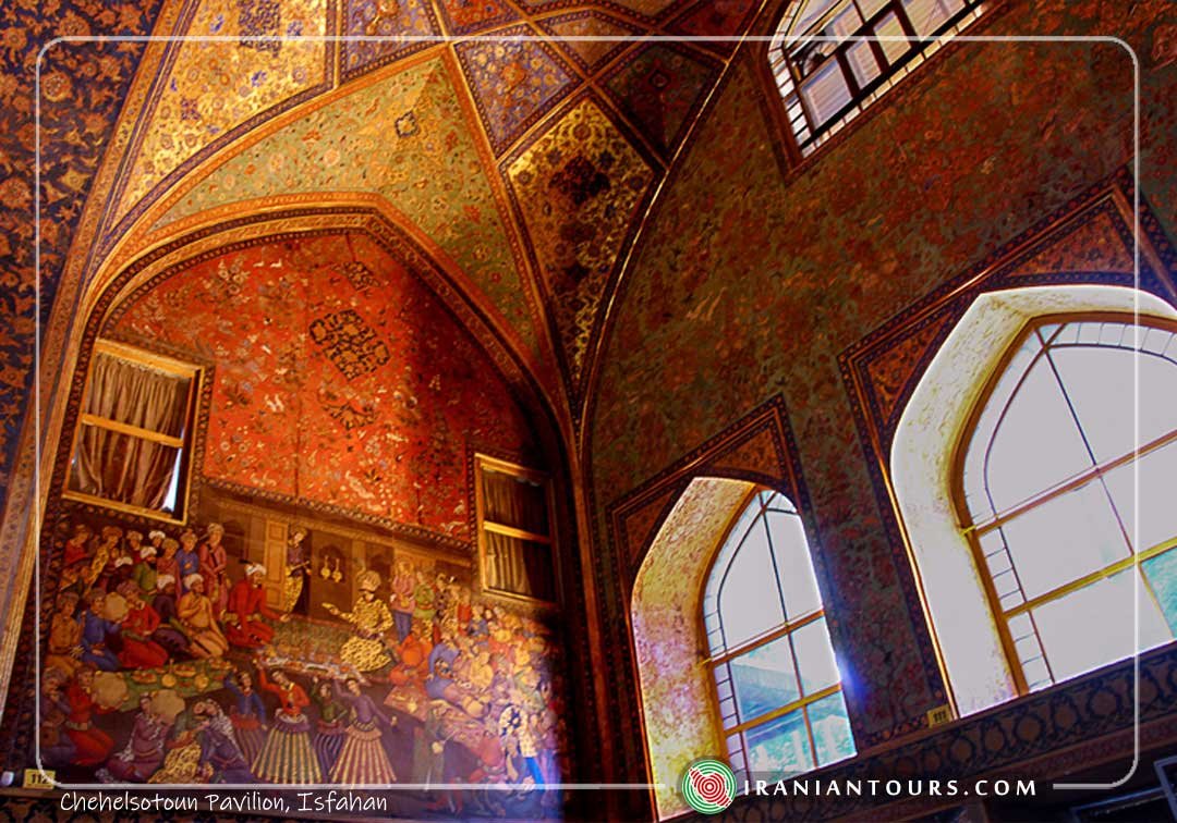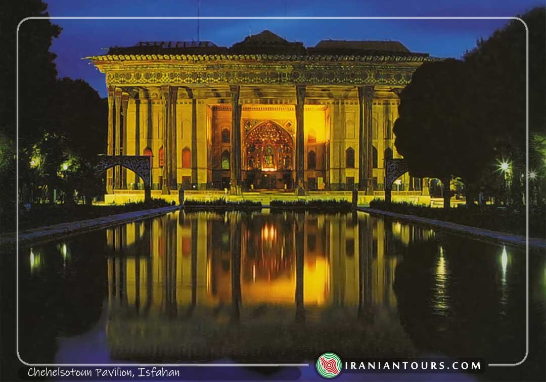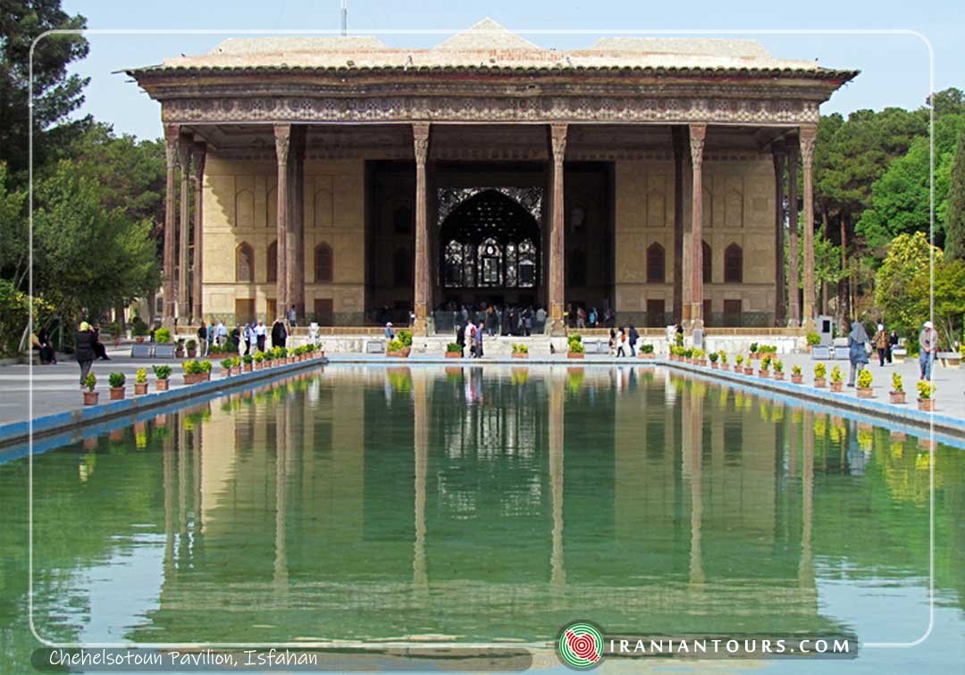 Chehel Sotoun (also Chihil Sutun or Chehel Sotoon, literally meaning “Forty Columns”) is a pavilion in the middle of a park at the far end of a long pool, in Isfahan, Iran, built by Shah Abbas II to be used for his entertainment and receptions. In this palace, Shah Abbas II and his successors would receive dignitaries and ambassadors, either on the terrace or in one of the stately reception halls.