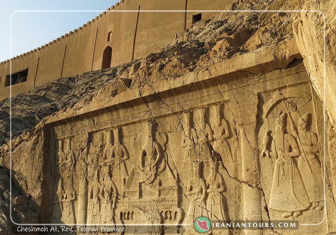 Another petroglyph is also remained of Fathali Shah in the west of the hill, on top of the sprig, underneath the ancient foundations of Rey. In the right side of this petroglyph, the king is on the throne with an eagle sitting on his right hand and an ornamented sword on his belt. In the middle of the scene, king is seen worn his unique crown with a mace in his hand, a dagger on his waist and a tasseled sword on his belt. The king is sitting on the thrown and two soldiers are standing in front of him. The depictions of courtiers are also observed in the left side of the petroglyph. Fortunately, some photos and paintings have been made from this Iranian ancient heritage during the last 200 years in order to maintain it for the future.