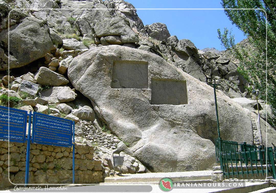 Ganjnameh (Ganjnāmeh), an ancient treasure located five km south-west of Hamadan, sits on the rocky face of Mount Alvand. The glorious imperial road of Achaemenids used to pass through a maze of the mountains, connecting the Achaemenid capital, Ecbatana, to Babylonia. As Ecbatana was the second capital of Achaemenids, Darius (486-522 B.C) ordered a relief to be carved hereafter Bisotun’s reliefs (515 B.C.) Later, his son, Xerxes (465-486 B.C), commissioned another relief with the same content next to that of his father. Darius’s relief is 2.90 meters long and 1.90 meters wide, located on the left, and it is slightly higher than the other one. The inscription on the right belongs to Xerxes with a length of 2.70 meters and a width of 1.90 meters. These nearly identical inscriptions depict the conquests of these two Achaemenid kings written in twenty lines and in three languages (Neo-Babylonian, Neo-Elamite, and Old Persian). The inscription in Old Persian is placed on the left side of each relief, the Babylonian inscription sits in the middle, and the Elamite inscription is located on the right. Both reliefs are written on concave rectangles with a depth of 30 cm, facing east.