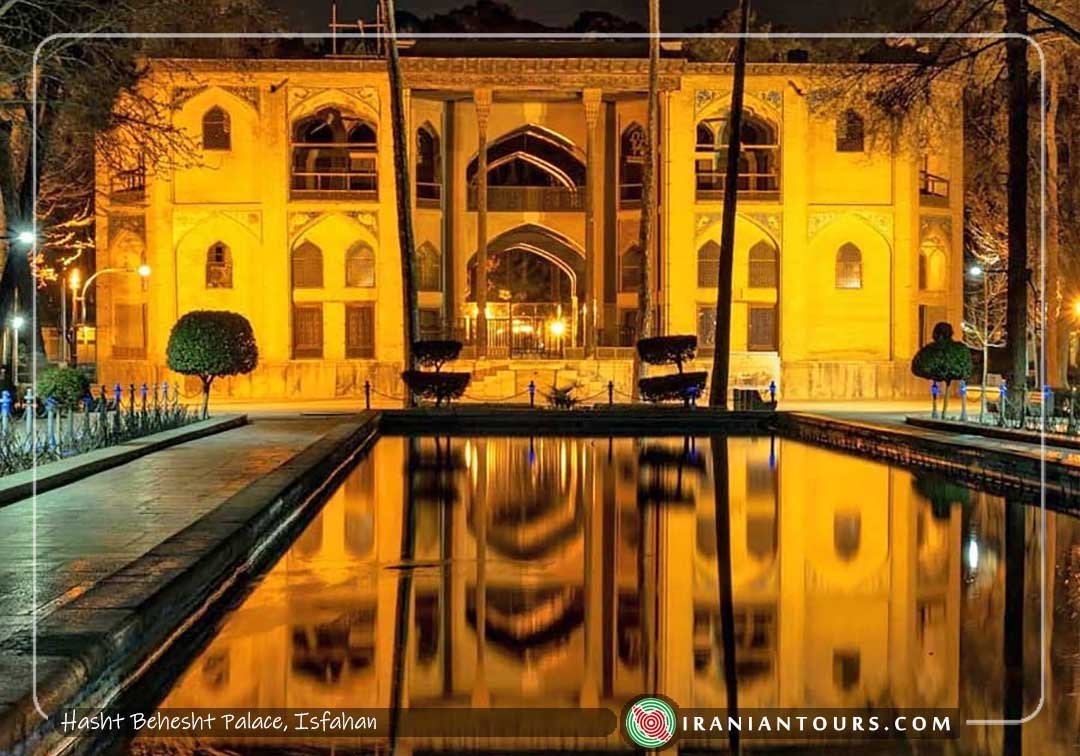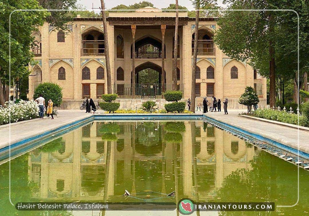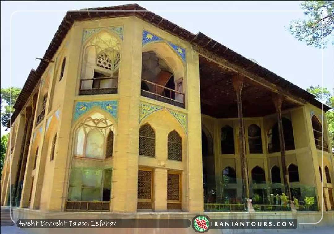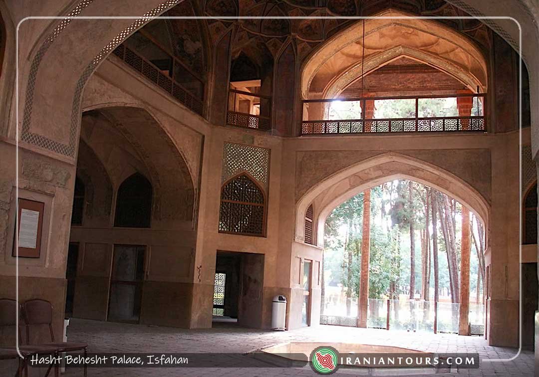As indicated on its name, the two-story pavilion of Hasht Behesht was built on the hasht-behesht plan, which is a type of floor plan consisting of a central hall surrounded by eight rooms. The building is of an octagonal shape and has two main entrances. Four larger sides of it feature large balconies (iwans), under which some tall and thin wooden columns are raised.