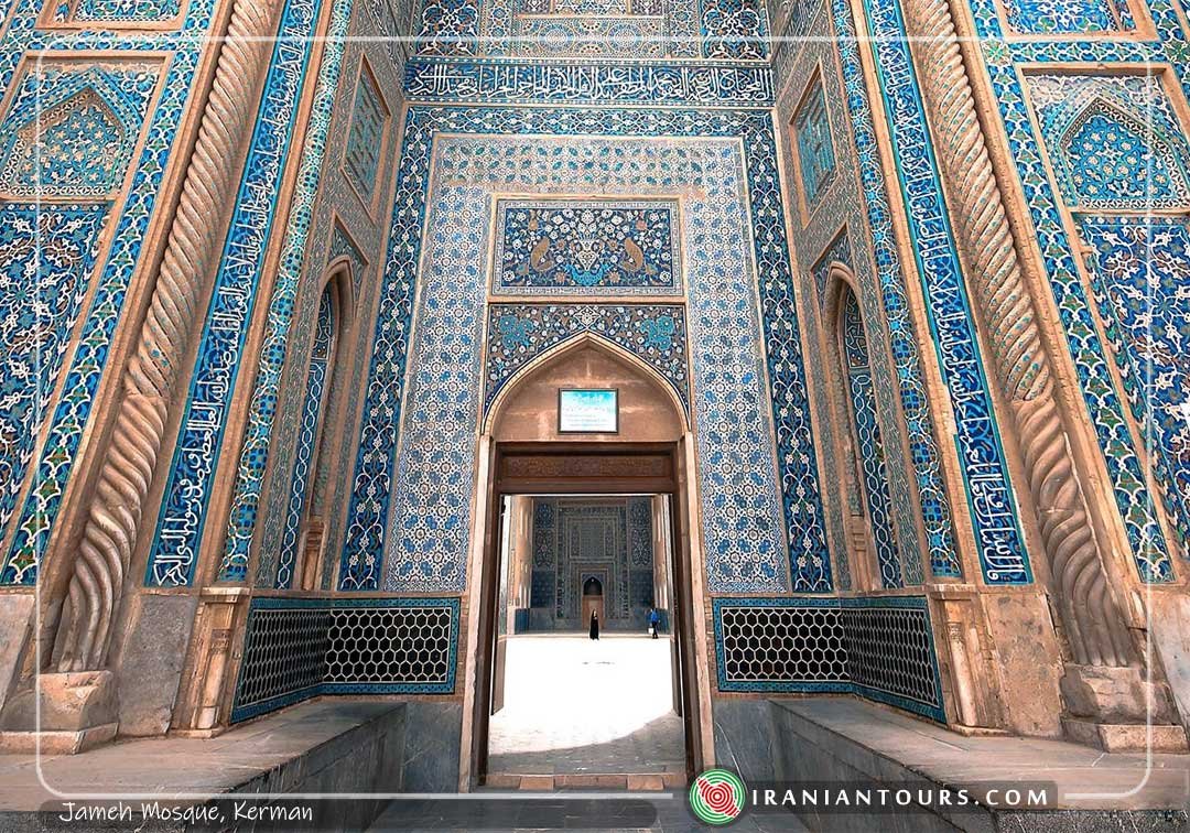 Jameh Mosque of Kerman was built at the time of Mubariz al-Din Muhammad, Muzaffarids, in the 14th century. The western side of the building features a high portal which has been decorated with decorative tile-works and a watch tower.
