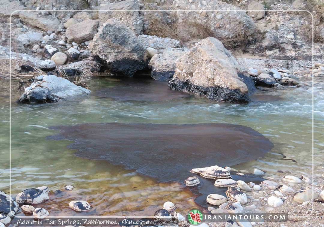 There are about ten kiln-like springs that have materials such as rocks and Sarooj mortar and are located around a small gully. The tars pour out of the springs along with oil, and water. The water flows and joins Ramhormoz River. Once it reaches the agricultural fields, there is very little tar and oil in it. Surprisingly, fish are living in the yellow and oily water of the river.