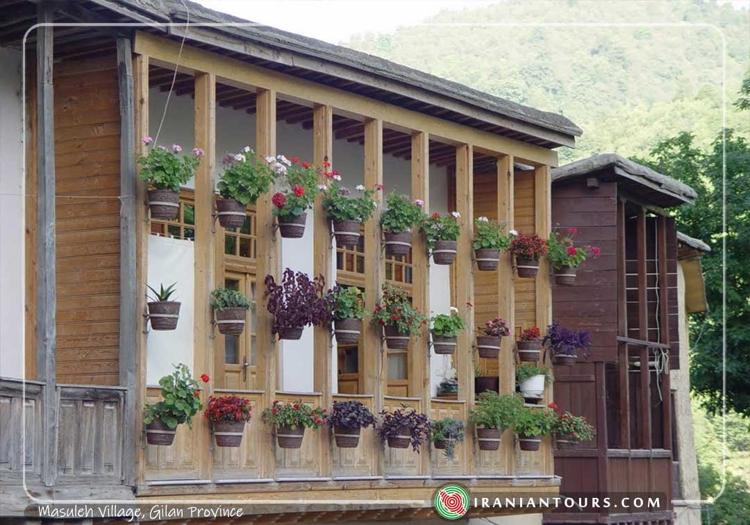 The houses in Masuleh, mostly built in two storeys, contain an entrance corridor, a storeroom, and stairs. Mostly built of stone, adobe and wood, these houses have a charm peculiar to the character of this town. They are decorated with two rows of windows holding exquisite wooden latticework and flower boxes distinguishing this town from other stepped villages in Iran, such as Oraman, Kang and Vafs.