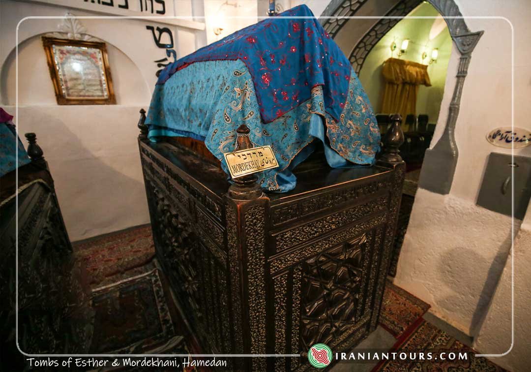 The current building of their mausoleum has a simple and humble structure mainly constructed of stone and brick. The structure is oriented toward the east (Jerusalem) and dates back to the 13th century. Entering through the low opening, you will step into the first room with a low ceiling. The interior walls are inscribed in Hebrew, bearing the names of those who had visited the mausoleum. The plasterwork on top of the walls is among the striking features of the building. The inscriptions on the wall give an account of the ancestors of Esther and Mordecai. A few steps down, you will enter the oldest part of the building (according to Ernst Herzfeld). This is the main hall of the mausoleum containing a 12-meter-high dome chamber that holds two coffins made of oak. The southern tomb is attributed to Esther, which is older, and the other one to Mordecai. The coffin is inscribed with passages from the Esther Book and the names of physicians who commissioned the restorations of the mausoleum in 1309 AD. The tombs are covered with fabrics donated to the mausoleum by believers who have wished for the realization of an intention through this giving away. The flanking room on the right side of the dome chamber is filled with chairs and used for praying.