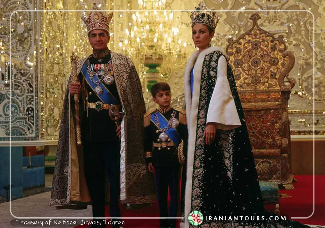 The crown used by Rezā Khān and Mohammad Reza Pahlavi named Taj-e Pahlavi (Pahlavi Crown), which is a red velvet crown decorated with 3380 pieces of diamond, 5 pieces of emerald, 368 pearls, and 2 sapphires. It is designed after the Sassanid crowns.